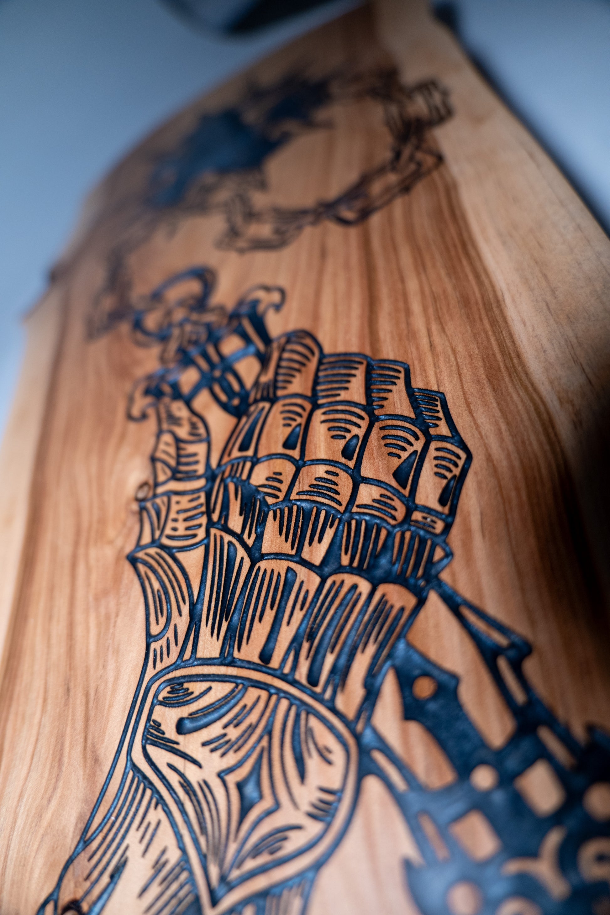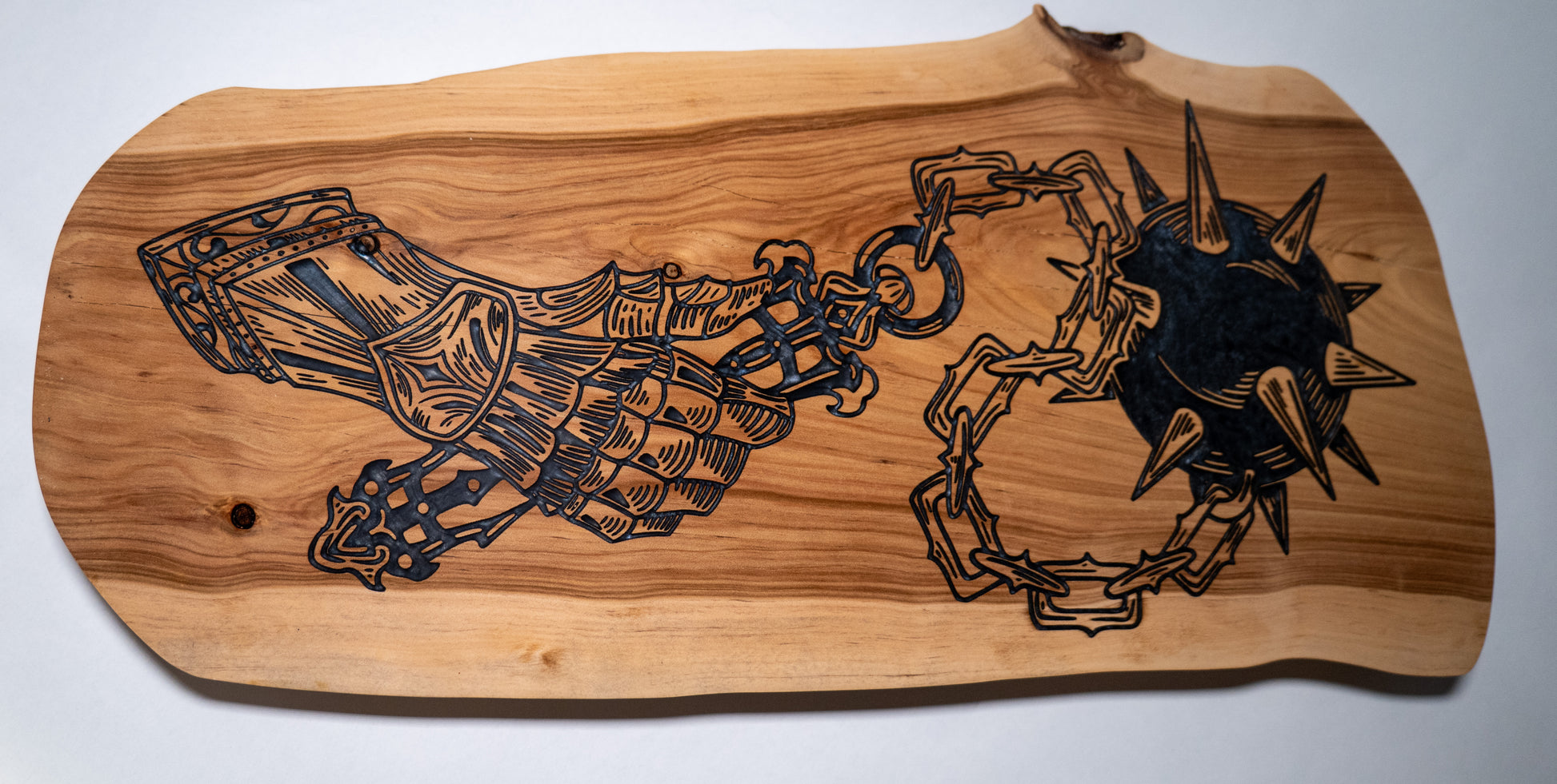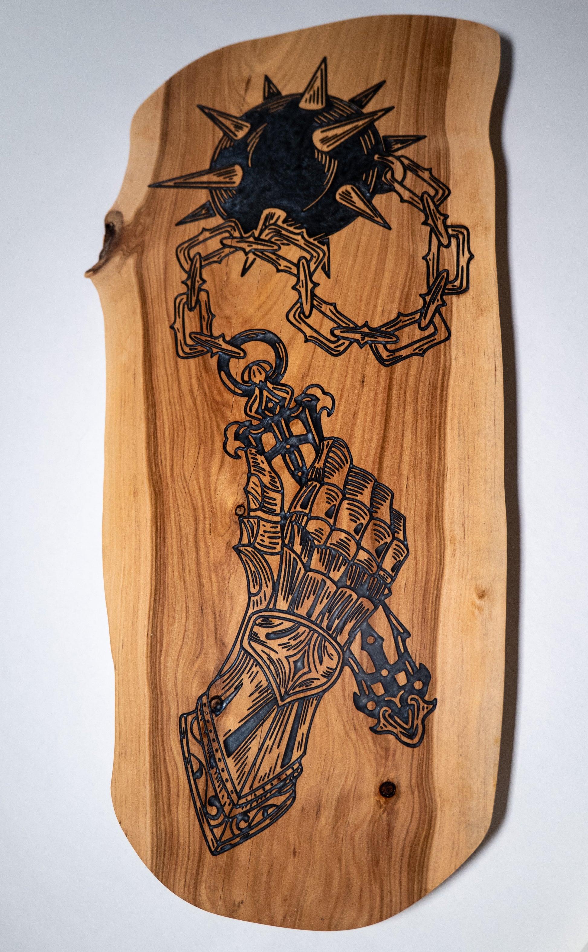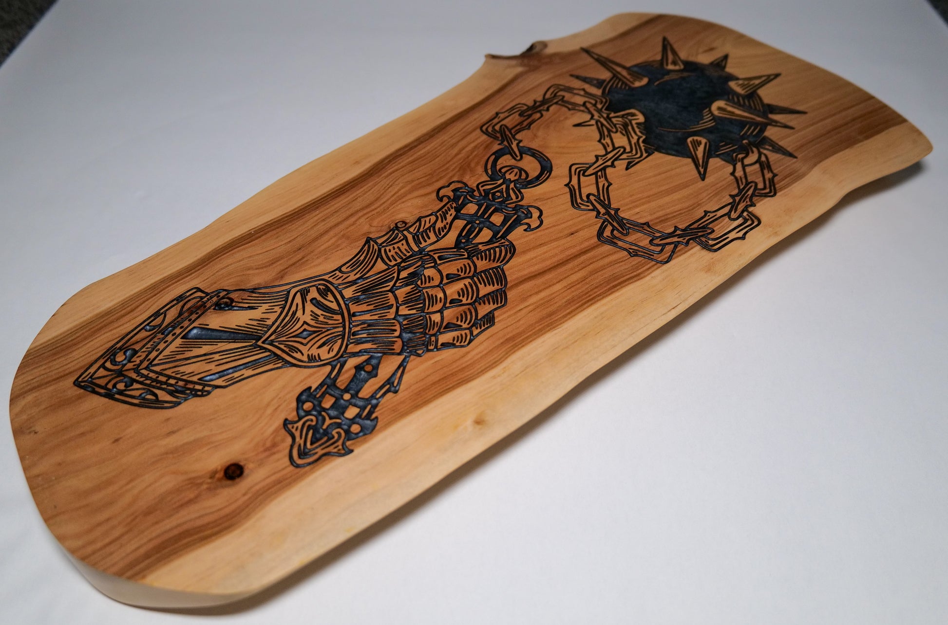 This striking artwork is crafted on a slab of beautifully grained cypress pine, featuring a bold engraved illustration of a medieval flail held by an armoured gauntlet. The design is brought to life with a shimmering silver resin inlay that adds depth and contrast against the warm natural timber. With its organic live edges and detailed craftsmanship, this piece makes a perfect wall display, gift, or functional décor item for medieval enthusiasts, gamers, and lovers of dark, intricate art.